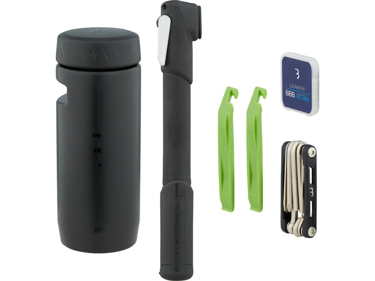 Lieferumfang:1 x Werkzeugdose BBB Tools & Tubes L BTL-18L1 x Minipumpe BBB WindWave BMP-541 x Multitool BBB MaxiFold S BTL-141S2 x Reifenheber BBB EasyLift BTL-811 x Reparaturset BBB LeakFix BTL-801 x Halterung für Minipumpe2 x Befestigungsschraube
