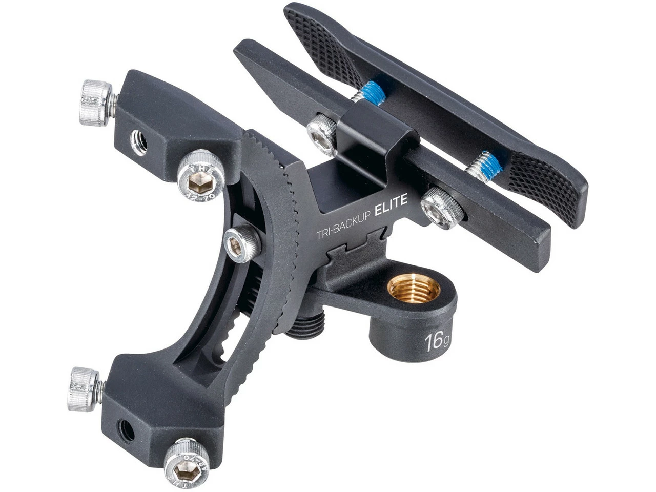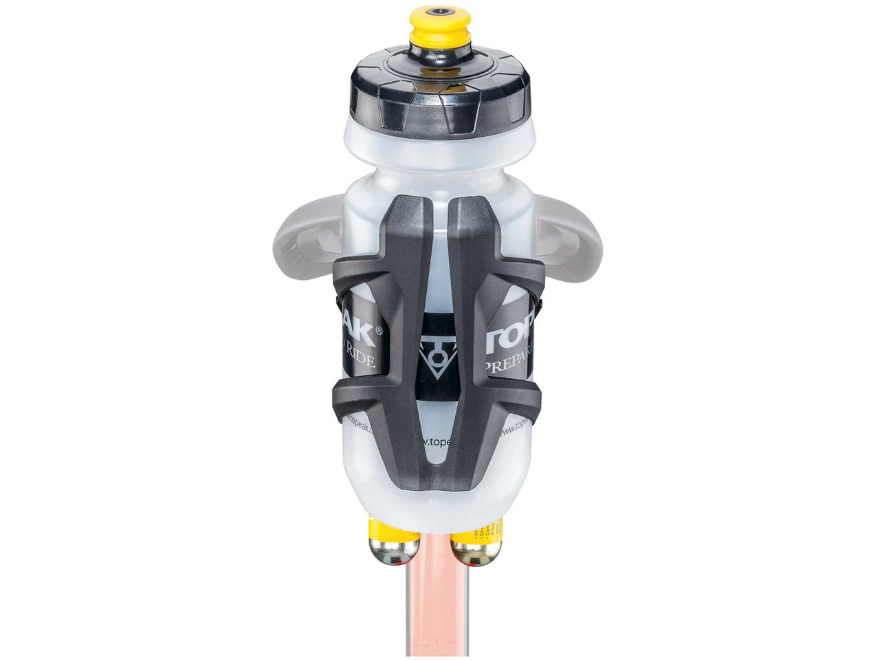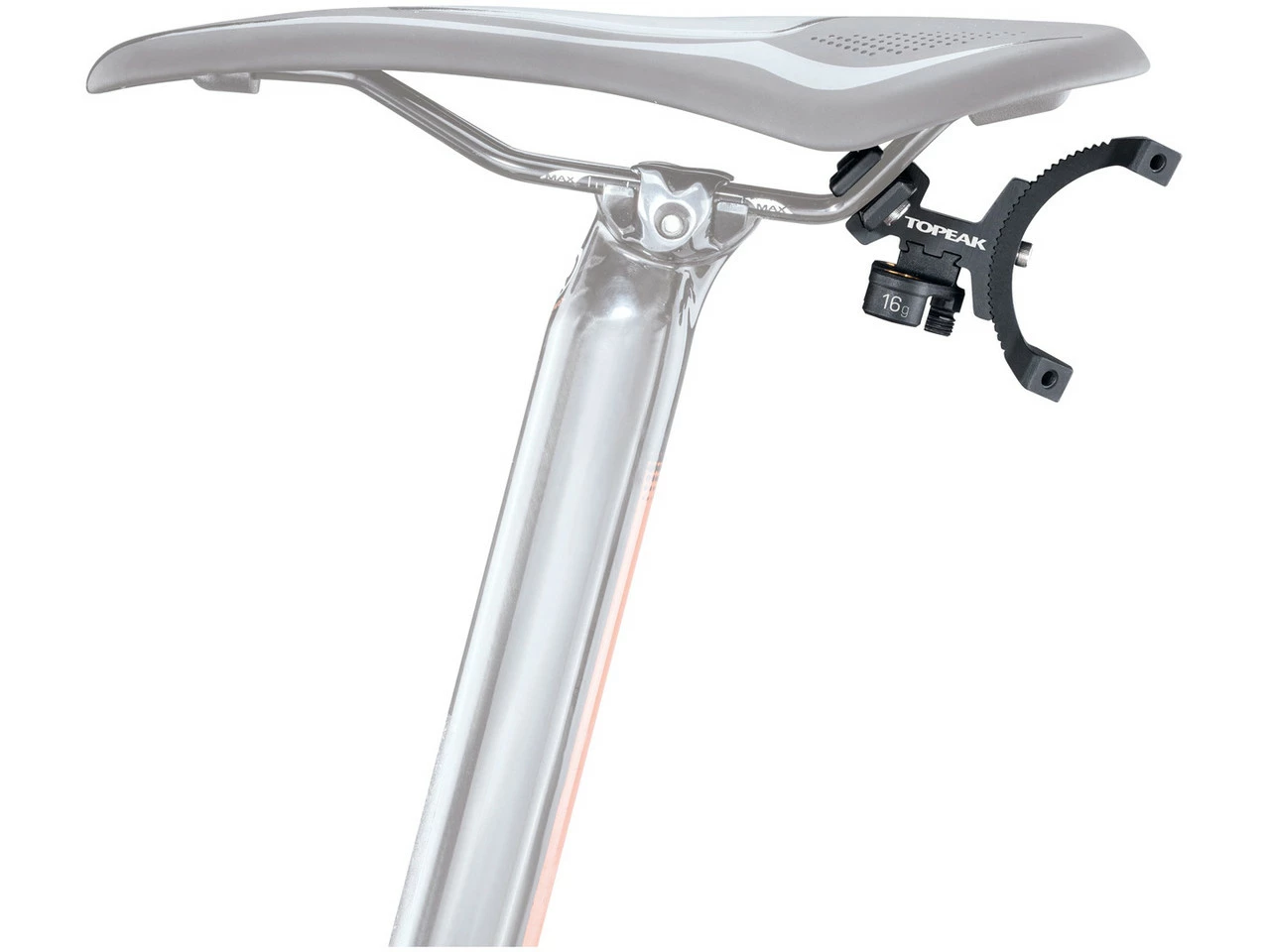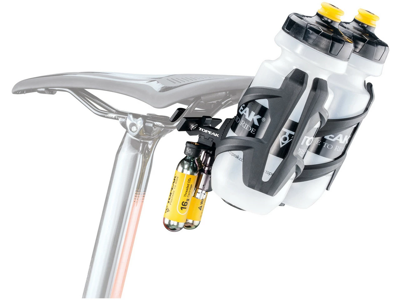Die Sattelbefestigung für Flaschenhalter wird am Sattelgestell befestigt und kann bis zu zwei Flaschenhalter, CO2 Kartuschen und einem Pumpenkopf aufnehmen. Der Winkel der Befestigung kann verstellt werden um Dir das Erreichen der Trinkflasche zu erleichtern.
